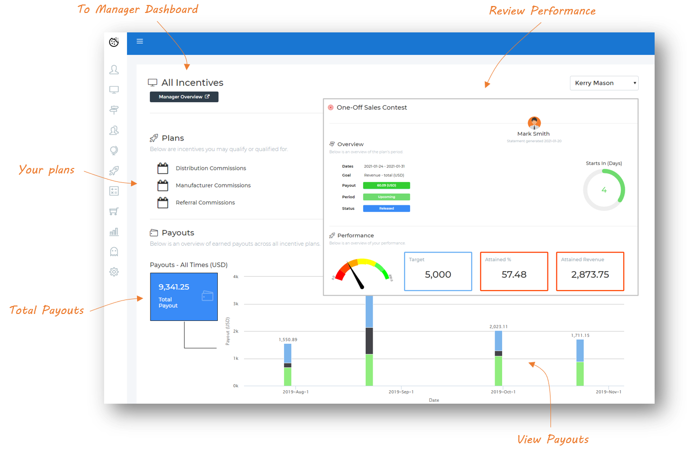 Every sales representative gets a personalized dashboard with their goals, crediting, and rewards.